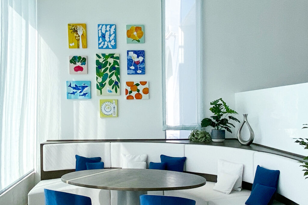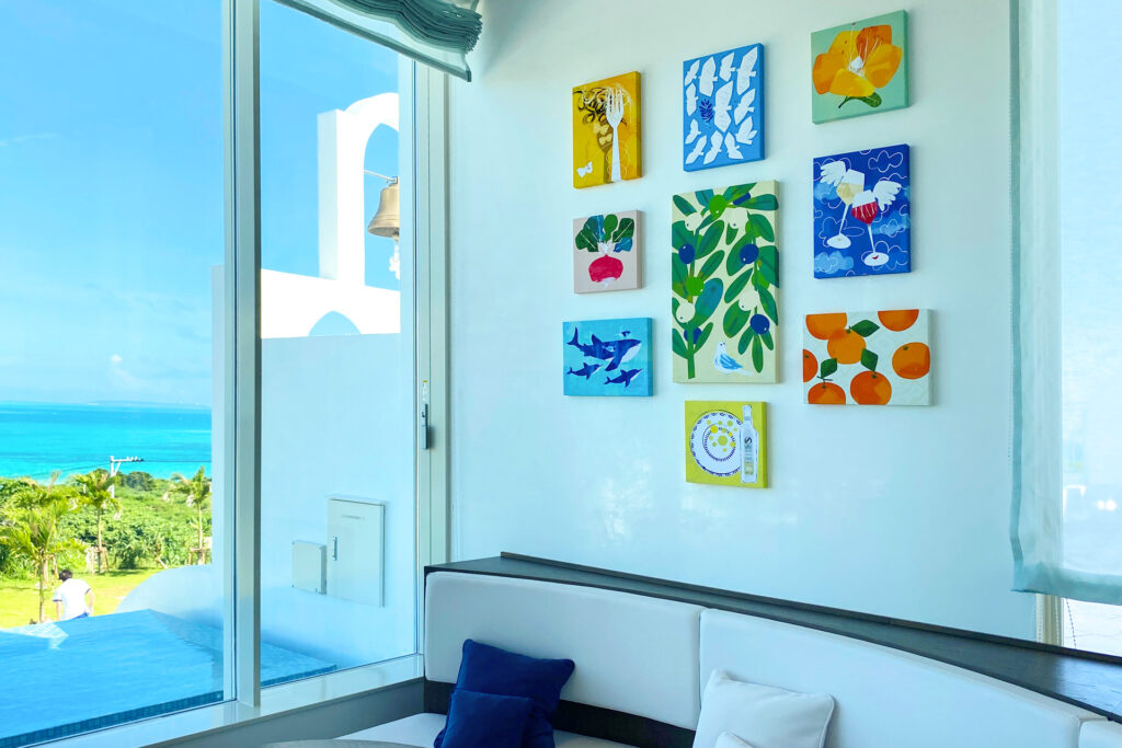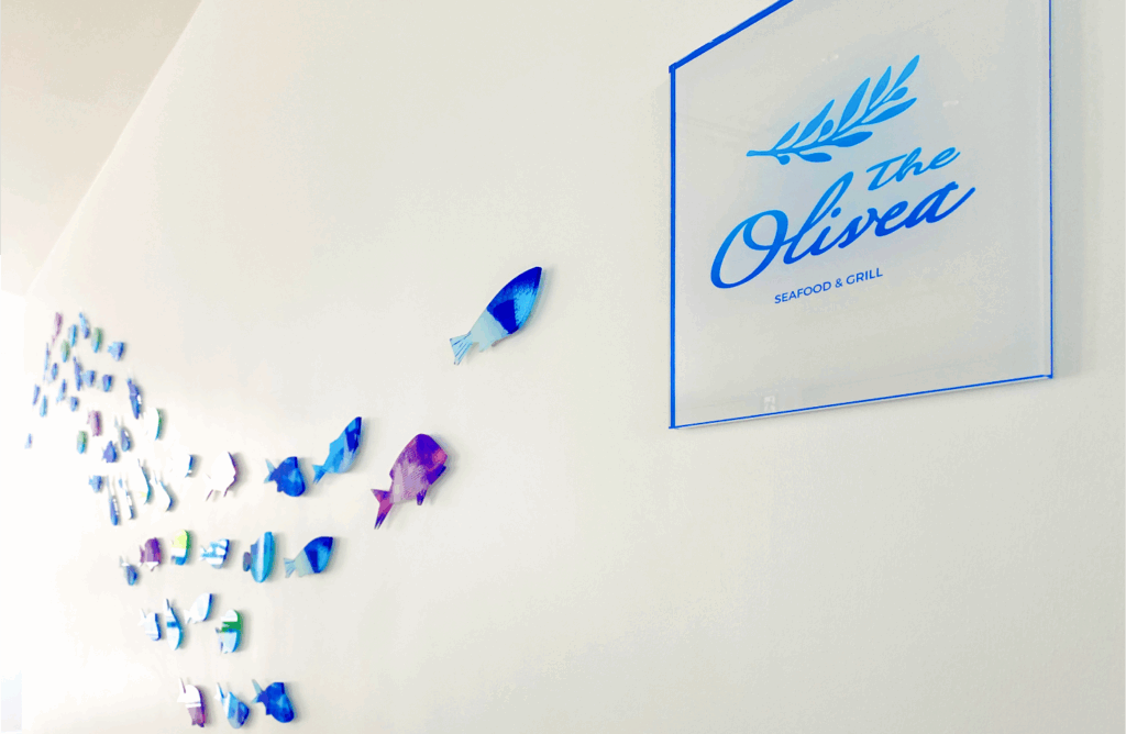 宮古島サントリーニホテルのメインダイニング「Olivea(オリビア)」レストランロゴ、壁面アート制作 大きく外光の入る白い空間にビビッドな彩りと明るく愉しい雰囲気をプラス 宮古島の自然と生き物、ダイニングの食材などをモチーフに、オリジナルアートを作家の Minoru Furuse 氏に依頼